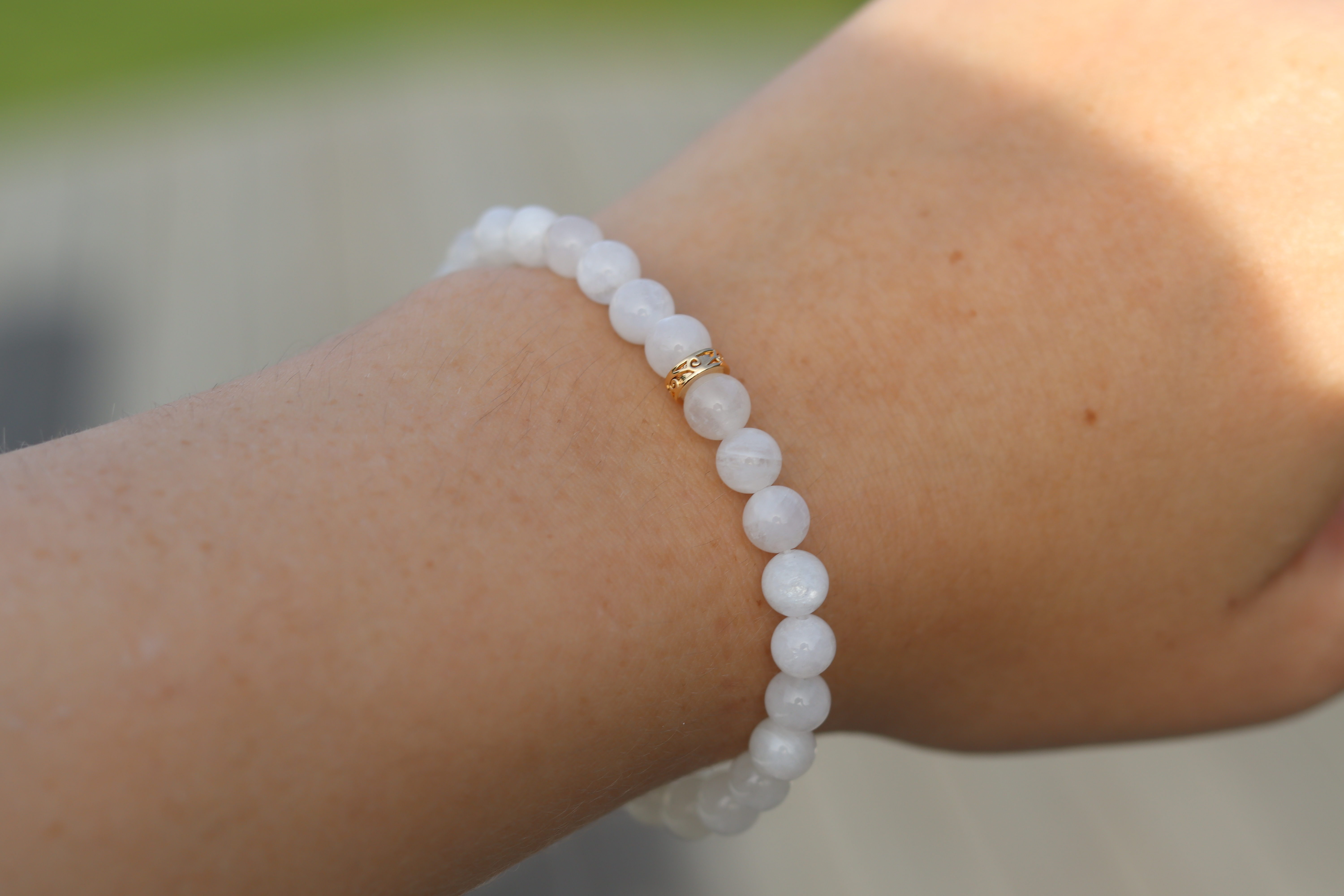 Dette armbåndet er laget med naturlige månesteinsperler, kjent for sitt myke fargespill og unike skimmer som symboliserer ro, balanse og tidløs eleganse. Gullperlen er nikkelfri og gullbelagt