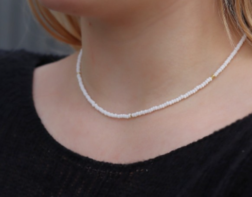Et elegant halskjede med hvite perler av høy kvalitet + gullbelagt og rustfritt stål materiale, justerbar m/lås