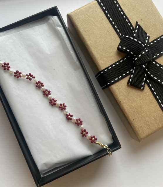 Et elegant og stemningsfullt armbånd med perler av høy kvalitet, nydelige blomster som varmer og gir smykket et unikt preg, gullbelagt/rustfritt stål materiale, passer fra størrelse 15cm - 18cm, perfekt å gi som gave til noen du er glad i eller deg selv!
