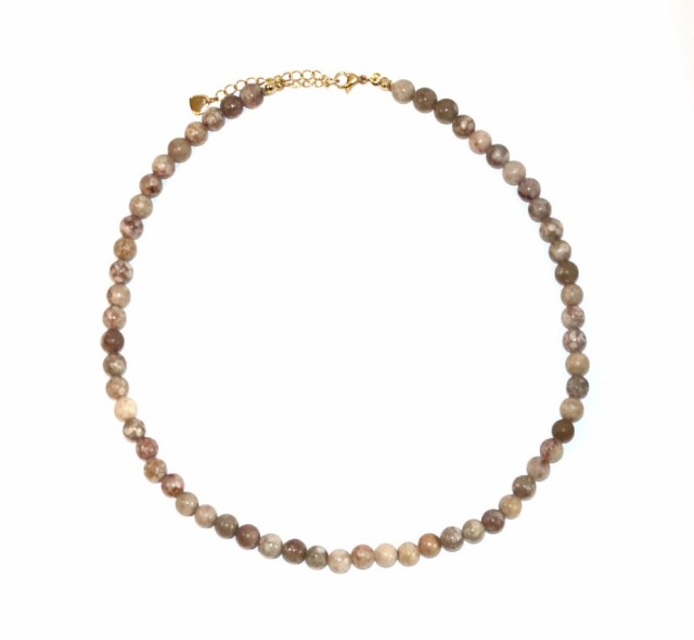 Dette halskjedet er laget med ekte Maifan-perler, en naturstein kjent for sine jordnære nyanser og subtile glans. Maifan-stein forbindes med harmoni og velvære, og gir smykket et rolig og balansert uttrykk. Gullbelagt materiale